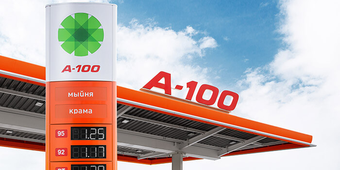 AZS “A-100” is a large-scale network of multifunctional gas stations with emphasis on high-quality service and attentive approach to each client. To increase brand awareness and distinguish from the competition, a corporate identity and a brand book controlling new style were introduced.